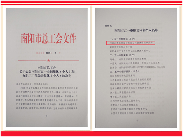 2019年5月15日,“南阳市总工会关于表彰南阳市五一巾帼集体(个人)和女职工工作先进集体(个人)的决定”在南阳宾馆顺利举行,市总工会党组书记、副主席汪天喜、市总工会副主席常晓革、市总工会副主席、女工委主任齐玲、市妇联副主席王伟等出席会议。会议决定,授予3个集体南阳市五一巾帼奖状,同时申报南阳市工人先锋号和南阳市五一劳动奖章等奖项,河南汇博医疗健康纺织事业部荣获南阳市总工会授予的“南阳市五一巾帼奖状”称号。
